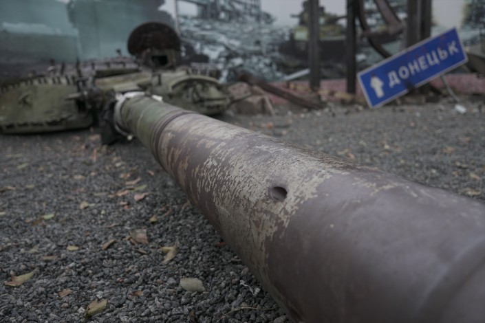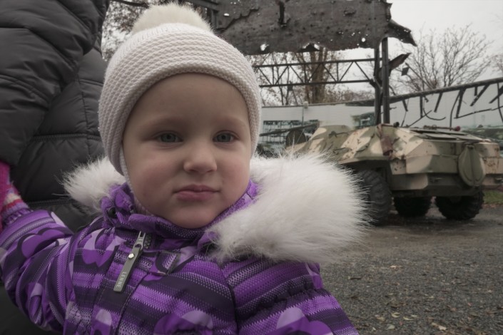 Посреди останков военной техники и простреленных указателей населенных пунктов гуляет женщина с ребенком.