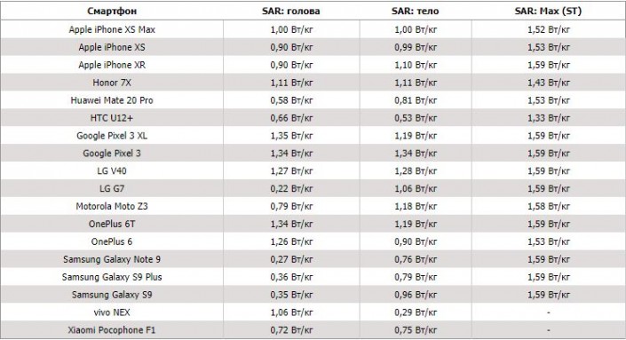 Если смотреть на максимальное единовременное излучение, то большинство смартфонов показывают уровень более 1,5 Ватт/килограмм и выше, включая все новые модели Apple iPhone, Google Pixel 3, Samsung Galaxy Note 9/S9 и другие.