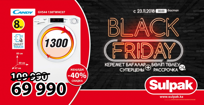 Конечно, в Казахстане пока шопинг-экстрима не наблюдается, как это есть на Западе, но и у нас распродажи года проходят с размахом. Так, к примеру, магазины придумывают интересные акции не только в офлайн, но и онлайн. В торговой сети "Сулпак" к Черной пятнице готовы. В этом году покупателей ждет отличное комбо-предложение. Во всех магазинах с 23 по 25 ноября будут действовать суперцены, а также рассрочка до 24 месяцев. Появится возможность приобрести технику по сниженной цене и оформить товары в рассрочку, без процентов и переплат.