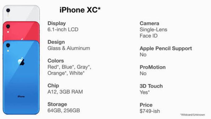 В бюджетном iPhone XС будет установлена одна камера и 6,1-дюймовый LCD-дисплей. Скорее всего, он получит тот же дизайн, что и флагманские модели, но рамки корпуса будут из алюминия. На последних фотографиях с возможными ценами iPhone XС представлен в пяти цветах (красном, голубом, оранжевом, сером и белом), а инсайдеры предсказывали шесть.