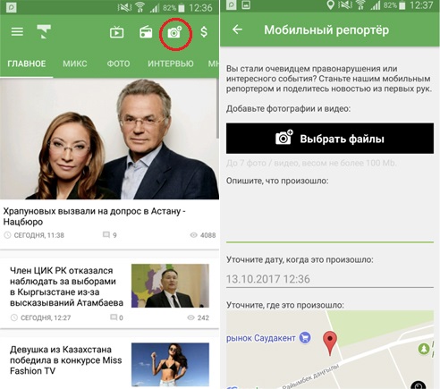 Кнопка раздела расположена в верхней части приложения, слева от курса валют. Для того чтобы отправить в редакцию фото- или видеофайл необходимо выполнить следующие действия.