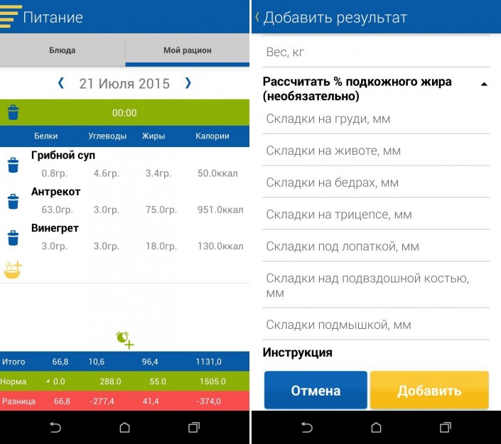 Чтобы оценить, сколько нужно есть и сколько заниматься, чтобы достичь необходимого результата, в приложении можно вести дневник, в котором указывается рацион пользователя. В списке по умолчанию есть несколько десятков блюд. Также можно добавить свои блюда, но для этого необходимо знать массу и энергетическую ценность каждого ингредиента. После этого можно подсчитать, насколько эффективной была диета и тренировки и насколько уменьшились или увеличились объемы различных частей тела.