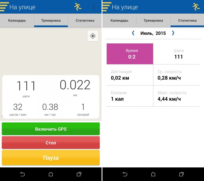 Еще одна функция - шагомер, который работает только со включенным GPS. Соответственно, точность измерений зависит от нескольких факторов. Лучше всего шагомер проявляет себя при ходьбе или беге по прямой или же по кругу с большим радиусом. Во время тестирования использовался маршрут с несколькими поворотами, поэтому некоторые показатели в приложении не соответствуют действительности. Если верить программе, при двухминутной прогулке сжигается примерно одна килокалория.