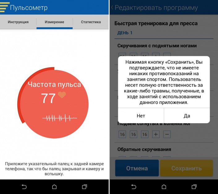 Также с помощью программы можно контролировать состояние своего здоровья, чтобы тренировки не нанесли вреда организму. Для этого рекомендуется регулярно измерять частоту пульса. Эта функция использует известную технологию, позволяющую определять частоту сердцебиения с помощью камеры и вспышки смартфона. Также в приложении всплывают предупреждения о том, что пользователь сам несет ответственность за свое здоровье.