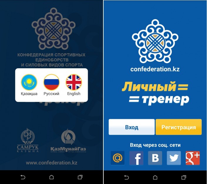 Стоит отметить, что программа "Жеке Бапкер" ("Личный тренер") поддерживает три языка - казахский, русский и английский. После выбора языка пользователю предлагается зарегистрироваться либо войти с использованием аккаунта "ВКонтакте", Facebook, Mail.ru, Twitter или Google+.