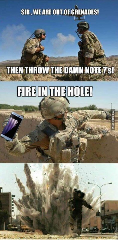 Пользователи шутят по поводу взрывоопасности флагмана компании Samsung - смартфона Galaxy Note 7, выкладывая в Интернет веселые картинки. Ниже несколько таких мемов.