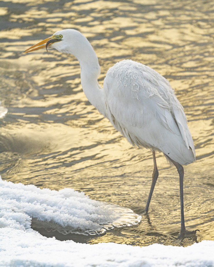 Пройдя озеро с севера на юг, фотографы не обнаружили цаплю и расстроились. Но в верхней части, где река Большая Алматинка впадает в Сайран, в полынье увидели грациозную птицу. По словам Дмитрия, она не просто стояла в воде, а охотилась за рыбой.