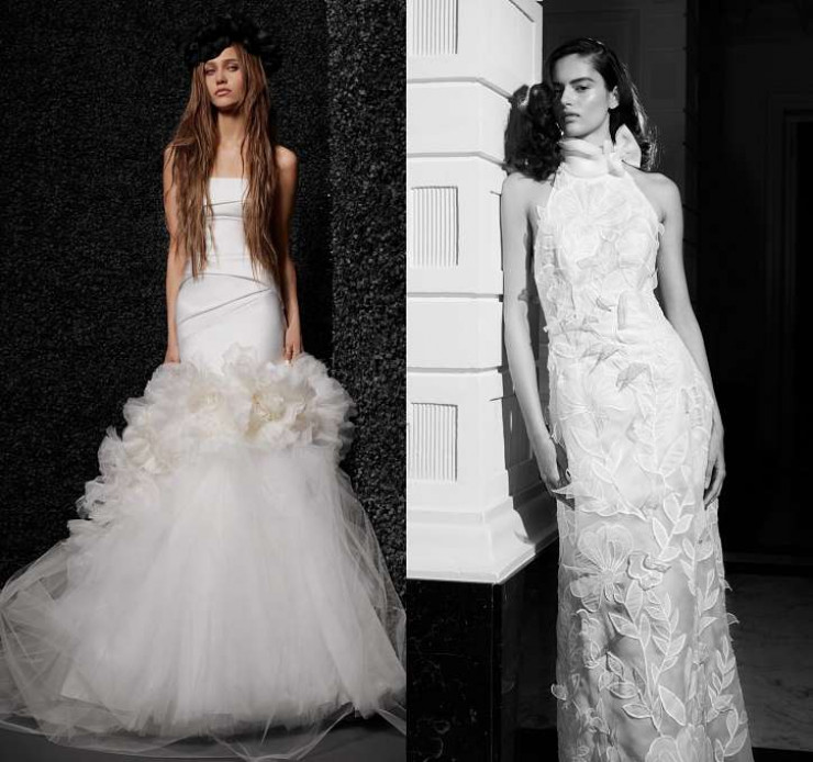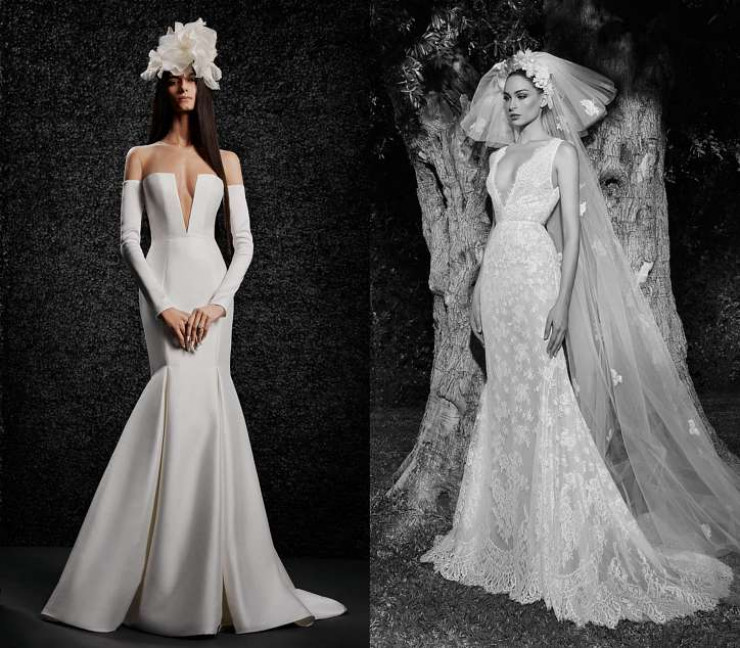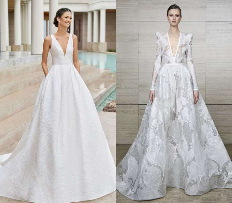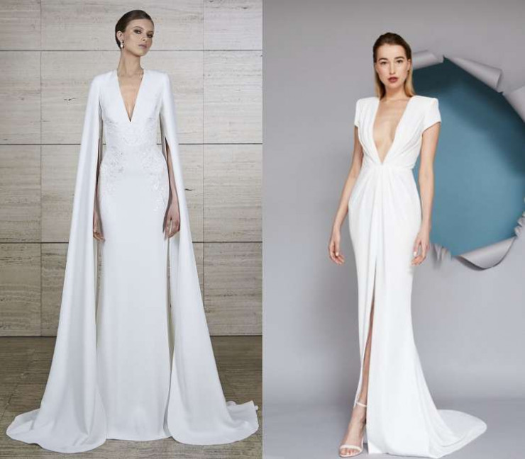 Глубокий V-образный вырез – один из самых горячих трендов весенне-летнего сезона. Практически во всех коллекциях, показанных на Неделях моды, были свадебные наряды невесты с таким смелым и откровенным декольте. Примеры – у Wona Concept, Dana Harel и Vera Wang.