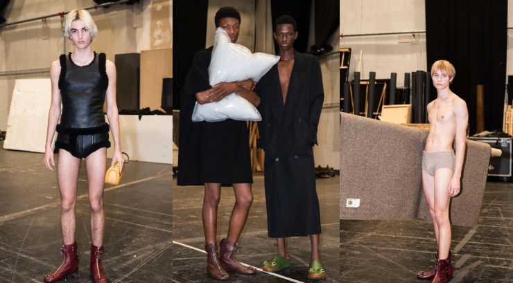В этот раз адептам классической моды показали сразу несколько триггеров: голых моделей, державших рулоны тканей в руках, ботинки и клатчи в виде лягушек, сумки и свитшоты с подушками.