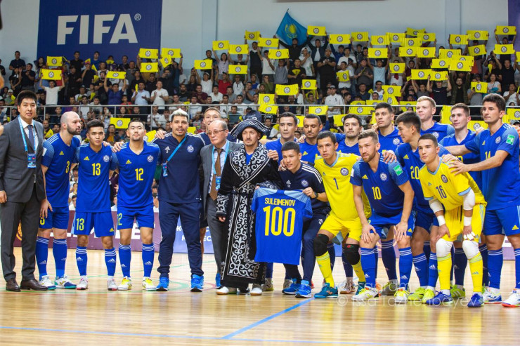 Встреча, проходившая в Актау, была прервана в середине первого тайма, когда виновнику, помимо памятных подарков, вручили футболку с цифрой 100 - именно столько матчей 41-летний футзалист отыграл за национальную команду.