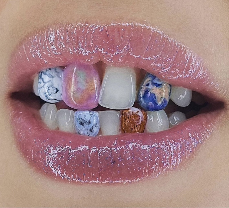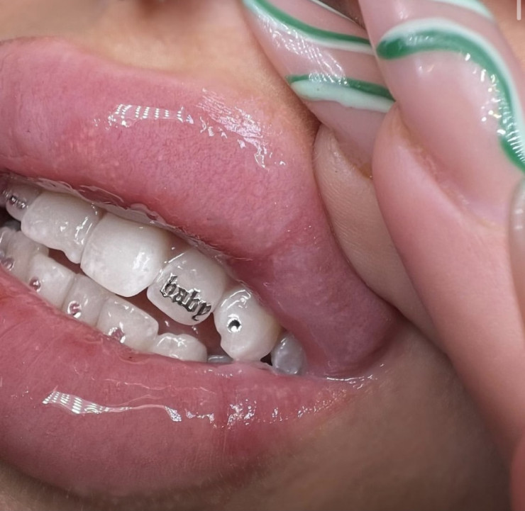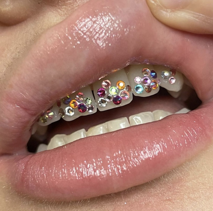 Разноцветные стразы в хаотичной россыпи - главный зубной тренд года. Такими накладками балуются юные тиктокеры и инста-знаменитости. К примеру, у казахстанской хип-хоп-исполнительницы Say Mo на передних зубах красуется сверкающая бабочка.