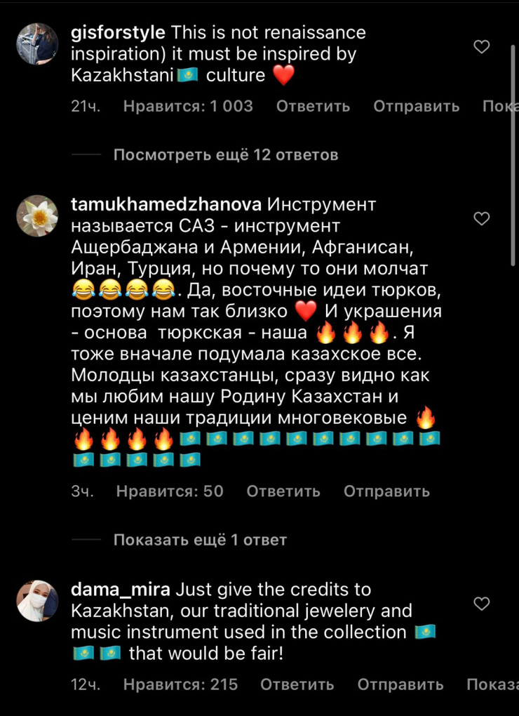 "Jewellery looks like Kazakh Shekelik" ("Украшение выглядят как казахский шекелик"), "Нағыз қазақ gucci емес, нағыз gucci – домбыра ??", "This is not renaissance inspiration. It must be inspired by Kazakhstani?? culture" ("Это вдохновлено не эпохой Ренессанса, а казахстанской культурой"), "Можно в суд на тему культурной апроприации, но мы, казахи, не злые и не жадные, просто скажите, что вдохновились нашей культурой", - пишут в комментариях казахстанцы.