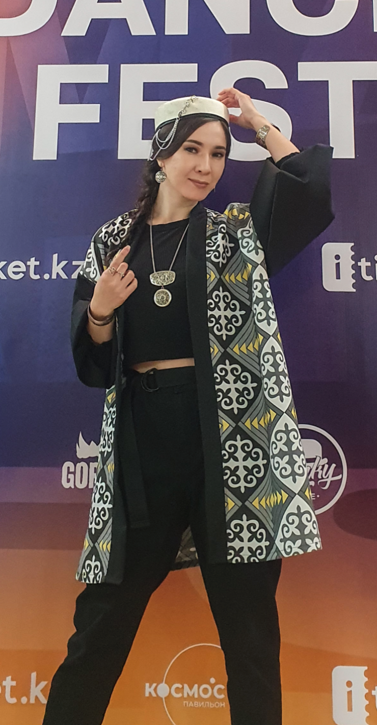 "Я люблю выбирать и продумывать стилизованные наряды на каждый свой танец. В этот раз даты совпадали с Наурызом, и, конечно, хотелось чего-то традиционного, но в современном стиле. Просматривала наряды казахских ансамблей, аутентичных показов моды, но времени было немного. Поэтому я нашла молодого дизайнера-самоучку, который сшил мне чапан и тюбетейку, пришлось немного ее переделать и добавить деталей. Серьги казахские мне подарила ученица из Киева, а украшение на шею - ученица из Индии. Так что получилось все интернационально, как у нас в стране", – делится Зарина.