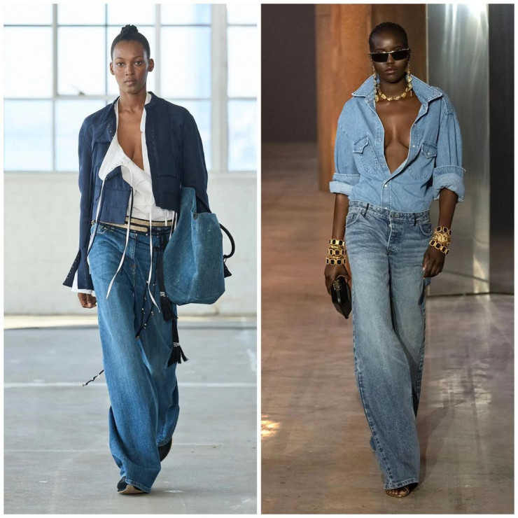 Это очень широкие джинсы. По словам стилиста, мы привыкли носить широкие джинсы с высокой посадкой, но дизайнеры в этот раз настаивают на средней, а лучше даже низкой посадке, которая все увереннее возвращается в моду.