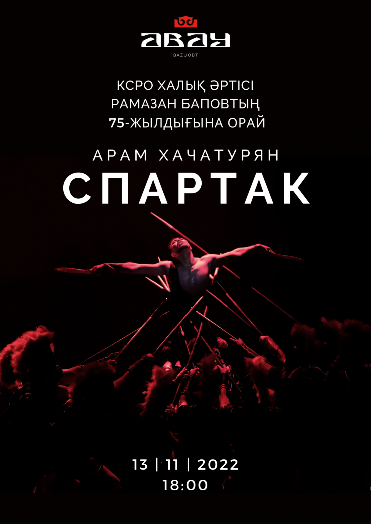 Артисты КазНТОБ имени Абая представят балет в трех актах композитора Арама Хачатуряна "Спартак". По сюжету, римский консул Красс с триумфом возвращается в Рим. Среди его пленников, обреченных на рабство, фракийский правитель Спартак и его возлюбленная Фригия. Гордый и мужественный человек, он протестует против бесчеловечности римлян, но силы не равны.