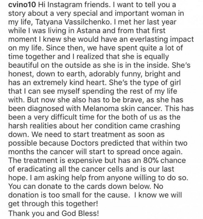 Нам нужно начать лечение как можно скорее, потому что врачи предсказывали, что в течение двух месяцев рак начнет распространяться снова. Лечение дорогое, но на 80 процентов есть шанс уничтожить все раковые клетки, и это является нашей последней надеждой. Я прошу помощи у тех, кто готов ее оказать. Вы можете пожертвовать на карты, указанные ниже. Никакое пожертвование не окажется слишком маленьким для этого дела. Я знаю, мы справимся с этим вместе!" - написал Тривино в Instagram.