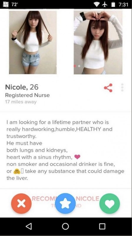 26-летняя медсестра Николь разместила свою анкету в Tinder и сразу же привлекла внимание пользователей. Как пишет L!FE.ru, дело не только в симпатичной внешности девушки, но и в ее специфических требованиях к избраннику.