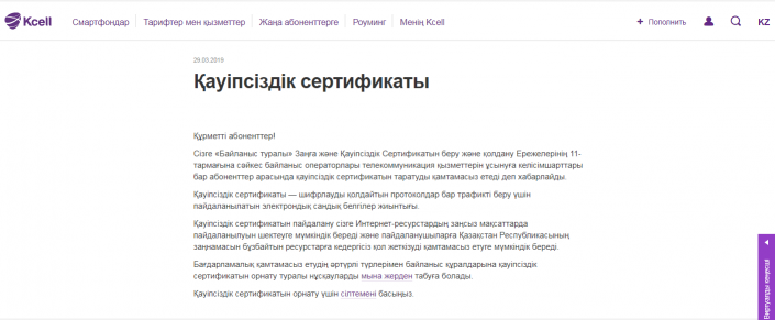Абоненттерге ұялы байланыс операторларынан qca.kz сілтемесі бойынша қауіпсіздік сертификатын орнату туралы SMS хабарламалар келген. Орнатылмаған жағдайда кейбір интернет ресурстардың қолжетімсіз болатыны айтылған.