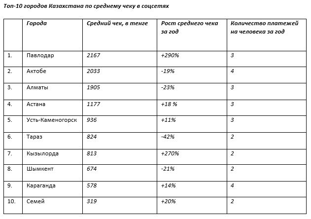 Также были обнародованы данные по расходам в соцсетях. Больше всего пользователи израсходовали на сервисах "ВКонтакте", "Мой Мир", "Одноклассники", Vichatter и "Фотострана". В среднем казахстанские пользователи соцсетей совершают три платежа в год и за раз тратят около 653 тенге. Они оплачивают игры, подарки, смайлики, стикеры и оценки, которые можно ставить другим пользователям. Люди платят также за премиум-аккаунты, попадание в топ рейтингов, режим "Невидимка" и возможность посмотреть посетителей своей страницы.
