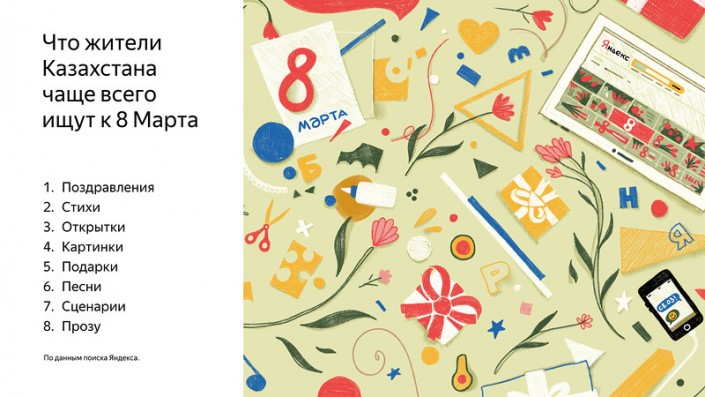 "Каждый год в начале марта казахстанцы заваливают поиск Яндекса запросами о Международном женском дне: всего за несколько дней о нем успевают спросить почти 700 тысяч раз", - отметили в пресс-службе компании.