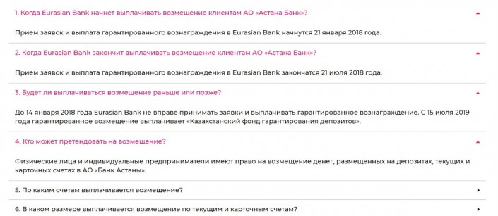 На сайте Евразийского банка в разделе "Помощь" появилась информация о том, как и когда клиенты Банка Астаны смогут возместить свои деньги с помощью Евразийского банка, передает корреспондент Tengrinews.kz.