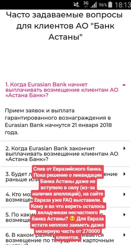 Фотографии страницы сайта Евразийского банка с рекомендациями клиентам Банка Астаны начали пересылать друг другу пользователи социальных сетей. На сайте сообщалось, когда начнут выплачивать возмещение клиентам Банка Астаны, кто может претендовать на возмещение, по каким счетам и в каком размере выплачивается возмещение и другая информация.