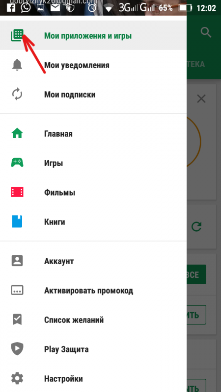 2. В программе Google Play нажмите на меню, отмеченное красной стрелкой.