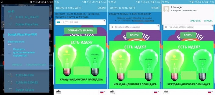 Так, в торгово-развлекательном центре Dostyk Plaza есть бесплатный Wi-Fi. Подключиться к нему можно только после успешной SMS-авторизации. В списке доступных сетей необходимо выбрать Dostyk Plaza Free WiFi, затем откроется окно "Войти в сеть Wi-Fi", где нужно ввести номер своего мобильного телефона и нажать "Отправить пароль". В течение пяти-десяти секунд вам придет сообщение с кодом доступа, который следует вбить в следующее окошко, затем нужно нажать кнопку "Войти". Только после этой процедуры выход в Интернет станет доступным.