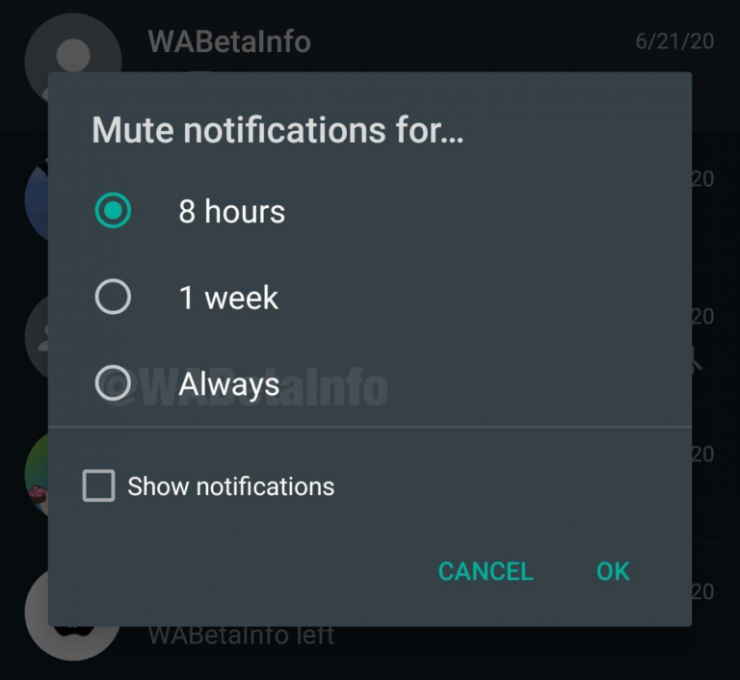 В скором времени мессенджер позволит своим пользователям навсегда отключить уведомления из определенных чатов. Если раньше данная услуга была доступна только на ограниченный период - восемь часов, одна неделя и один год, то теперь опцию на один год заменит пункт "навсегда".