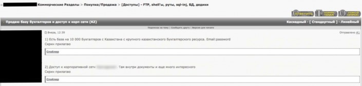 "Проведенный мониторинг различных площадок "черного рынка" сети Интернет позволил обнаружить предложения о продаже данных с сайта balans.kz. В качестве доказательства продавец прикладывает около 20 аккаунтов сайта balans.kz и сообщает их общее количество - 10 000. Таким образом, исходя из имеющейся информации, можно сделать вывод, что произошедший инцидент напрямую задевает интересы 10 000 бухгалтеров, каждый из которых представляет интересы одного или нескольких юридических лиц", - сообщили в Центре анализа и расследования кибератак.