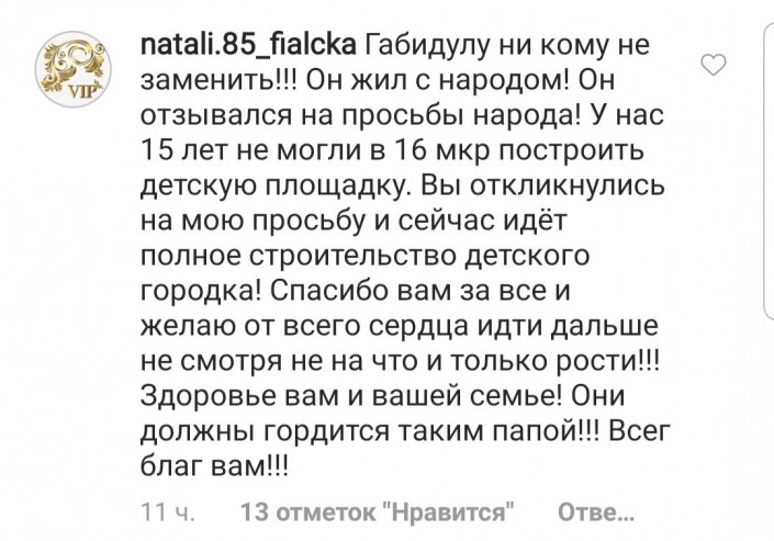 "Габидуллу никому не заменить. Он жил с народом. Он отзывался на просьбы народа. У нас 15 лет не могли в 16-м микрорайоне построить детскую площадку. Вы откликнулись на мою просьбу, и сейчас идет полное строительство детского городка. Спасибо вам за все", - подхватывает @natali.85_fialcka.
