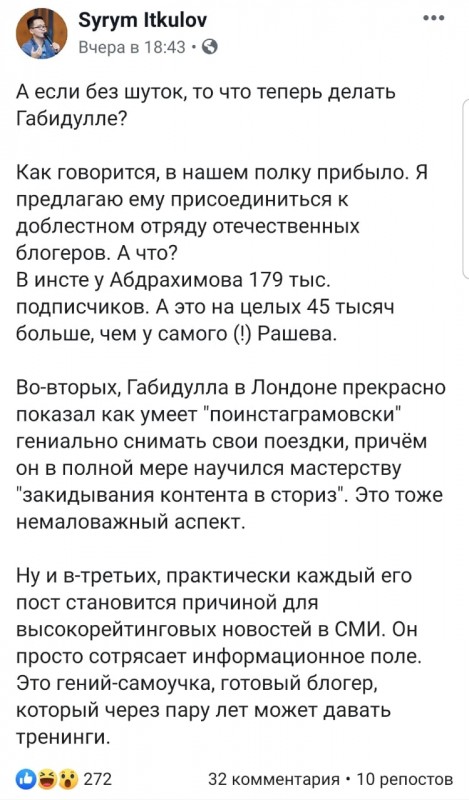 "Габидулла Абдрахимов назначен первым заместителем мэра Лондона", - шутит в Facebook Syrym Itkulov. А в следующем своем посте он предлагает экс-акиму стать блогером: