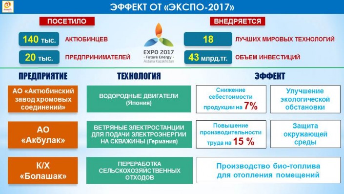 В целях дальнейшего совершенствования производственных процессов актюбинские предприятия внедряют 18 лучших мировых технологий, представленных на EXPO-2017, на сумму 43 миллиарда тенге. Ожидается, что применение данных технологий положительно скажется на экологической обстановке в регионе, повысит эффективность энергопотребления и производительность труда. В целом выставку посетили 140 тысяч актюбинцев, в том числе представители 92 крупных предприятий области, более 20 тысяч предпринимателей.