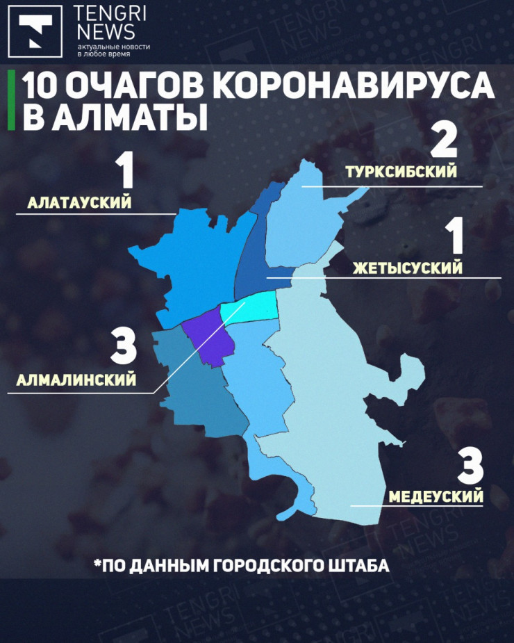 По результатам эпидемиологического исследования, на территории  Алматы выявлены 10 очагов COVID-2019: три в Алмалинском районе, три - в Медеуском, два - в Турксибском и по одному в Жетысуском и Алатауском районах.