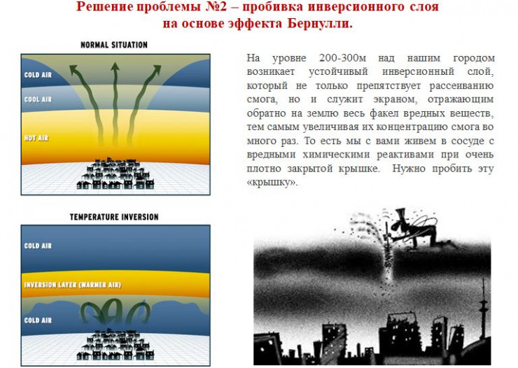 Они выделили две основные проблемы: в Алматы мало ветра и большую часть года стоит штиль. Также на высоте 200-300 метров над городом формируется инверсионный слой, отражающий смог обратно на землю. Такое природное явление действительно наблюдается в городах, расположенных в высокогорье, где холодный воздух спускается с гор и скапливается у земли, а затем не может подняться выше, так как воздух выше будет теплее. В результате усложняется нормально движение воздуха снизу вверх.