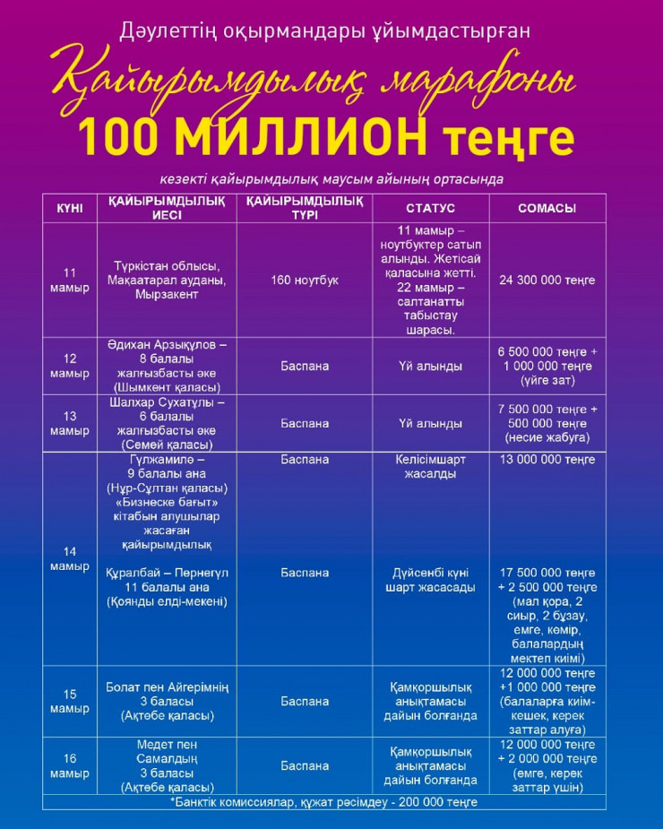 "Оқырмандарымызбен Рамазан айында да көбірек қайырымдылық жасайық деп шештік. Мамырдың ортасында басталған акцияда 100 миллион теңге көлемінде қайырымдылық жасадық. 11 мамырда суға кеткен Мақтаарал ауданының тұрғындарына көмектесу үшін 24,3 миллион теңге жинадық. Біз оған ауданда биыл мектеп бітіргелі отырған түлектерге 160 ноутбук сыйлаймыз деп шештік", - дейді блогер.