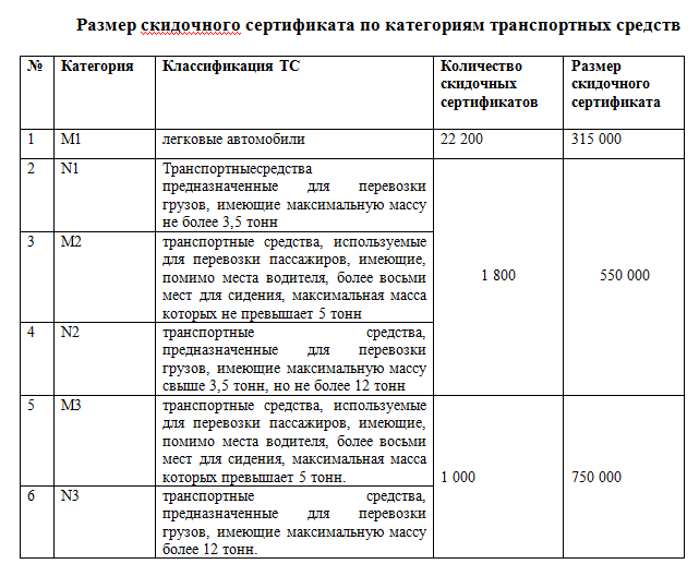 Кроме того, профильное министерство согласовало увеличение размера скидочного сертификата при сдаче на утилизацию грузового и пассажирского транспорта. С 20 февраля 2019 года при сдаче вышедшего из эксплуатации транспортного средства (ВЭТС) владелец получает сертификат размером 550 и 750 тысяч тенге, в зависимости от категории ВЭТС, ранее размер сертификата за них составлял 450 тысяч и 650 тысяч тенге. Размер скидочного сертификата за сдачу старого легкового автомобиля на утилизацию остается прежним - 315 тысяч тенге.