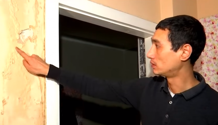 По словам Руслана Джоева, он переехал сюда в 2014 году и с тех пор вынужден минимум дважды в год делать ремонт. Из-за протекающей крыши в его квартире постоянно сыплется штукатурка, сыреют обои. А после последнего дождя мужчина даже был вынужден увезти из дома детей.