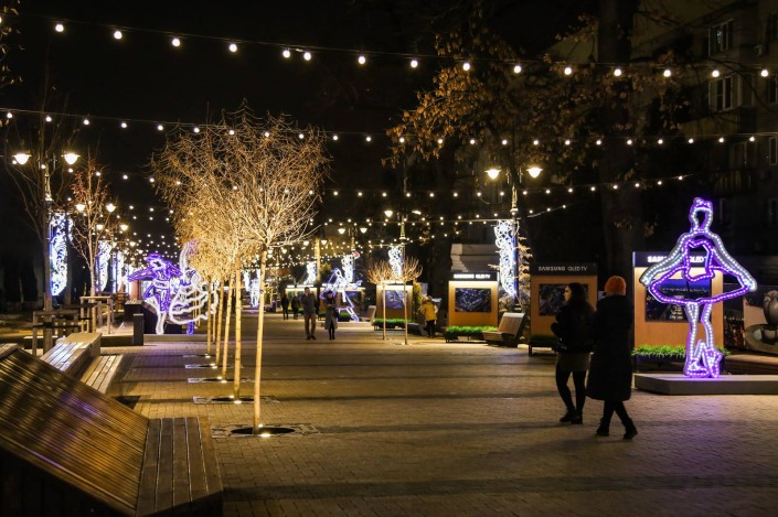 По всей Панфилова установили фонтаны, урны, фонари, малые архитектурные формы. Улицу покрыли гранитной плиткой.