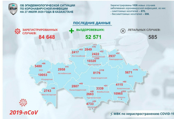 В Казахстане по состоянию на 27 июля зарегистрировано 1526 новых случаев заболевания коронавирусной инфекцией, передает Tengrinews.kz со ссылкой на МВК по нераспространению COVID-19.