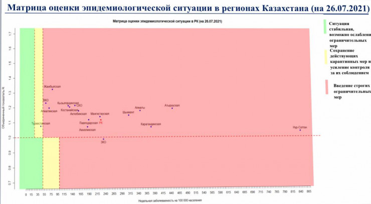 Согласно матрице оценки эпидемиологической ситуации в регионах Казахстана на 26 июля, в "красной" зоне находятся города Нур-Султан, Алматы, Шымкент, Акмолинская, Актюбинская, Алматинская, Атырауская, Восточно-Казахстанская, Жамбылская, Западно-Казахстанская, Карагандинская, Костанайская, Кызылординская, Мангистауская, Павлодарская и Северо-Казахстанская области.