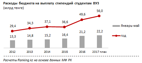 За 2016-2017 учебный год по причине финансовых трудностей выбыло 17 тысяч студентов вузов, из них 11 тысяч - из частных, приводят данные аналитики Ranking.kz. При этом общая численность студентов вузов выросла на 4 процента, составив 477 тысяч человек, а число студентов, получающих стипендии, сократилось почти на три тысячи человек (-2 процента). Это в итоге привело к снижению доли стипендиатов с 31 до 29,4 процента.
