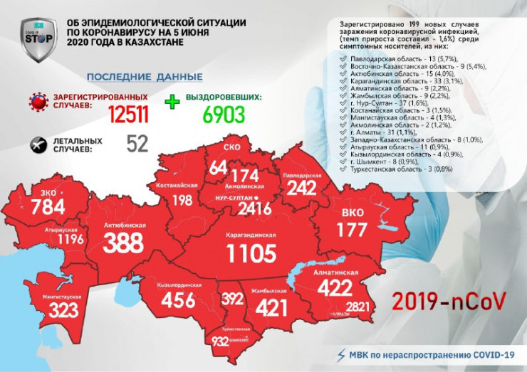 В Казахстане за прошедшие сутки выявлено 199 новых случаев коронавирусной инфекции, передает корреспондент Tengrinews.kz.