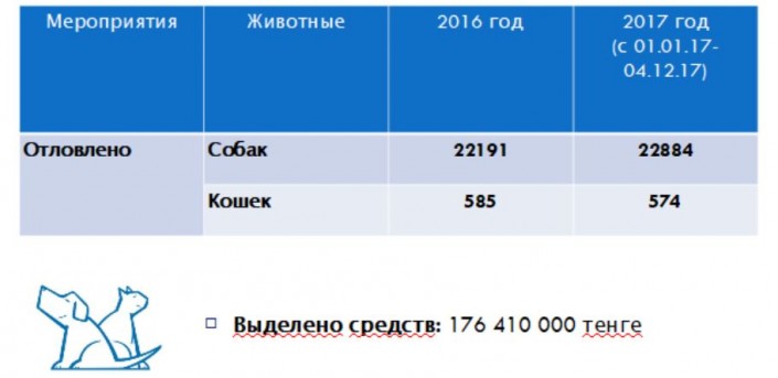 На отлов бродячих животных центру в 2017 году выделено 176 миллионов тенге. 2 723 собаки, 335 кошек вернули хозяевам. Закуплено 52 клетки-переноски. Приобретены: новые петли (не позволяющие причинять вред животному), сеть для отлова, клетки с приманкой, метательное приспособление, ошейники, поводки, новые миски.