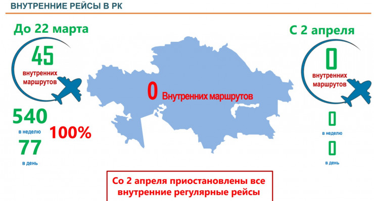 "В целях предотвращения распространения коронавируса в Казахстане по международным направлениям было сокращено 438 рейсов в неделю (с 442 до четырех частот). Закрыто выполнение всех регулярных внутренних рейсов, и отсутствует регулярное воздушное сообщение на территории страны. До 22 марта на внутренних маршрутах выполнялось 540 рейсов в неделю. Со 2 апреля приостановлены все внутренние регулярные рейсы между городами Казахстана", - говорится в сообщении.