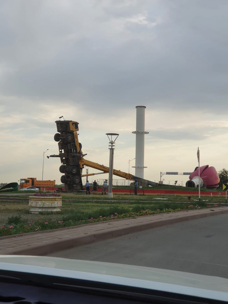 В соцсетях сообщили о падении строительного крана в ходе демонтажа скульптуры тюльпана высотой 25 метров. В частности, журналист Михаил Козачков в своем Telegram отметил, что тюльпан установили при прошлом акиме области Бердибеке Сапарбаеве к 25-летию независимости Казахстана в 2016 году, так как тюльпан является символом города. По предположению журналиста, при новом акиме тюльпан решили убрать вовсе или сделать еще выше - до 30 метров - уже к 30-летнему юбилею страны.