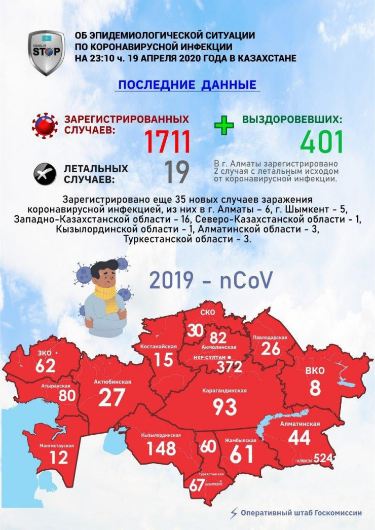 По состоянию на 23:10 19 апреля в Казахстане зарегистрировано 35 новых случаев заражения COVID-19. Об этом сообщает оперативный штаб Госкомиссии.