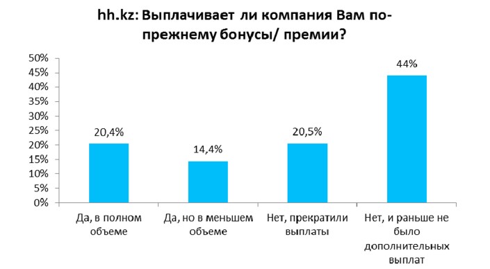 Однако каждый пятый респондент (20,4 процента) отметил, что его работодатель по-прежнему выплачивает в полном объеме бонусы и премиальные. Также, один из пяти опрошенных (20,5 процента) заявил, что в его компании прекратили выплаты бонусов и премий. Еще 14,4 процента респондентов отметили, что дополнительные выплаты в их компании продолжаются, но в меньшем объеме.