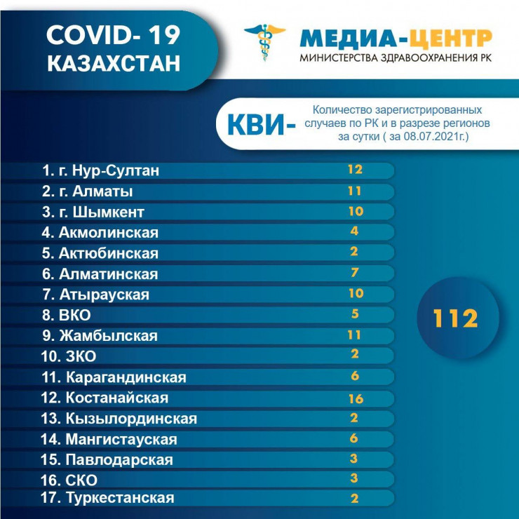 Количество зарегистрированных случаев КВИ- по РК и в разрезе регионов за сутки (8.07.2021 год):