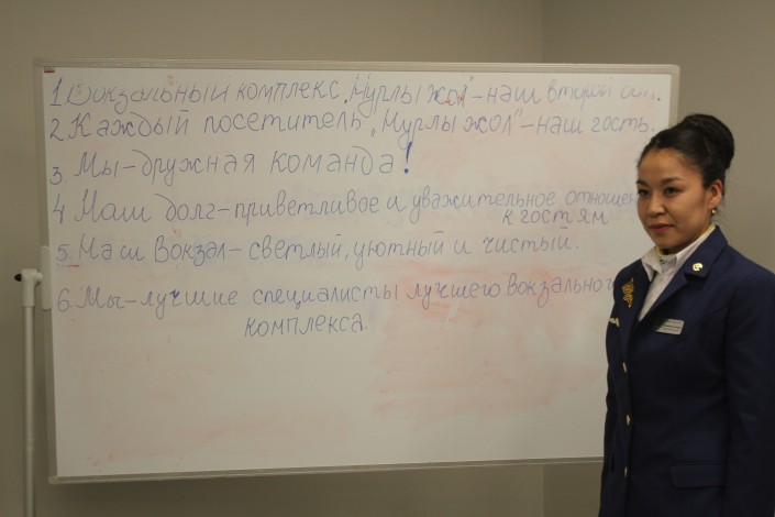 Как отметили в администрации вокзала, соблюдение всех норм поведения при общении с пассажирами является обязательным условием для работников, связанных с их обслуживанием. Например, утро сотрудников начинается с вот такой кричалки, которая, по их словам, мотивирует их на рабочий день с положительными эмоциями.